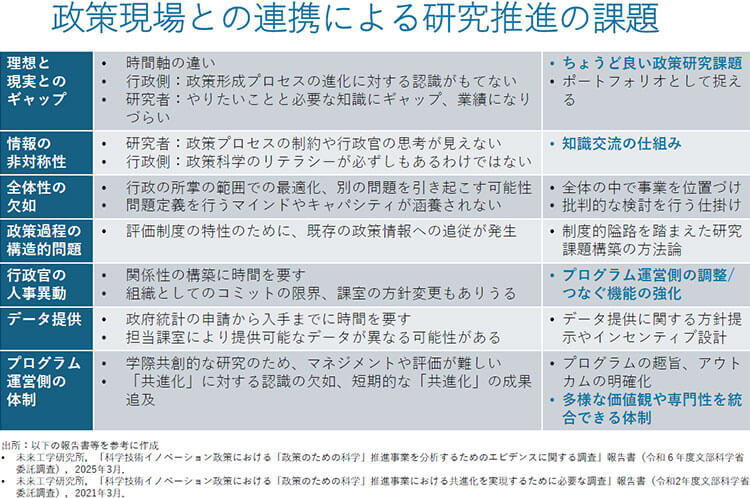 しかし、理想と現実にはまだギャップがあります。安藤氏は、SciREX事業が行政のEBPMサイクルの中に位置付けられてきたとはいえず、そのためにEBPMへの貢献が限定的だったと振り返ります。事業のアウトカムやインパクトを明らかにすべく行ったアンケート等を通じて見えてきた政策現場との連携における課題としては、時間軸の違いやお互いが持つ知識の非対称性、行政官の人事異動、データ提供の困難さ、プログラム運営側の体制などが挙げられました。特に、いかに課題設定するかが大きな課題だといいます。「行政官は短期的な成果を求めるのに対して、研究者は中長期的な視点を持って臨んでいる。互いにちょうど良い政策研究課題をどのように設定するか」に難しさがあると安藤氏は指摘します。