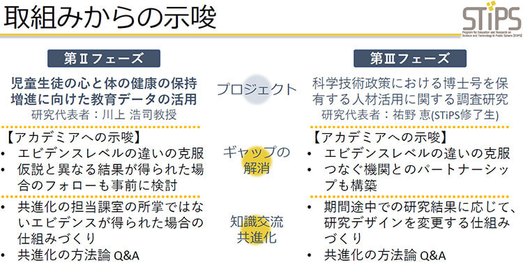 最後の教訓として祐野氏は、こうした共進化を進めていく上で、行政官側の所掌ではないエビデンスが得られた際の対応の難しさを挙げました。「研究としては仕上がっていても、出てきたエビデンスが第Ⅱフェーズでパートナーだった文部科学省の担当課室の所掌ではなく、(成果を)使ってもらえそうにない状況が起きた」と説明しました。また、第Ⅲフェーズから得られた教訓として、研究結果に応じた研究デザインの途中変更を可能にする仕組みづくりの必要性も示しました。「第一段階目で得られたエビデンスから次に何を考えるかは、研究を設計するうえで(柔軟さが必要で)、例えば科学研究費補助金であれば変更が認められている内容。研究はやはり動的な作業。そのことを行政官にご理解・ご対応いただく必要がある」と述べました。