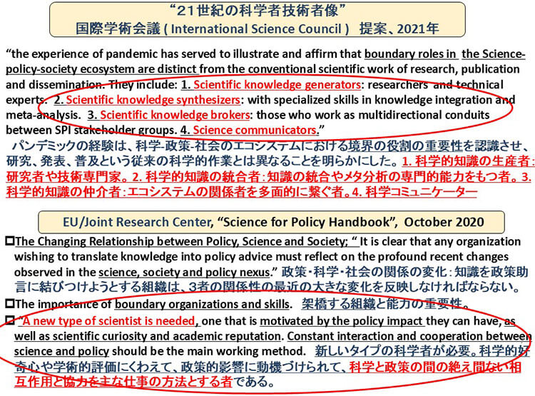 ディスカッションに移る前に、有本氏は、パネル討論「STI政策人材育成教育プログラムによる15か年の取組の成果とこれから」で議論された人材育成の観点に触れながら、新たな時代の科学者・技術者像を再定義する必要もあると述べました。COVID-19によって引き起こされたパンデミックでの経験を踏まえて、2021年の国際学術会議が提示した「21世紀の科学者技術者像」では、科学-政策-社会のエコシステムにおける境界の役割が変化しているとされました(図2参照)。その中で示されている「Scientific knowledge generators(科学知識の生産者)」には、政策のための科学分野でのトップサイエンティストも含むと考えられると、有本氏はいいます。これに加えて、分野横断的に科学の知をイノベーションにつなげるための“科学的知識の統合者”として「synthesizer」の役割も取り上げ、科学と政治行政と社会を架橋する中間人材とそのキャリアの重要性を指摘しました。そして、「Science communicator」についても、欠如モデルに拠った単なる知識伝達者ではなく、市民との対話を通じて新たな課題を共有し信頼を醸成し、社会実装へとつなげる存在として位置づけ直す必要があると述べました。