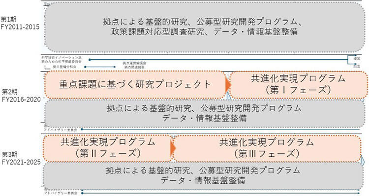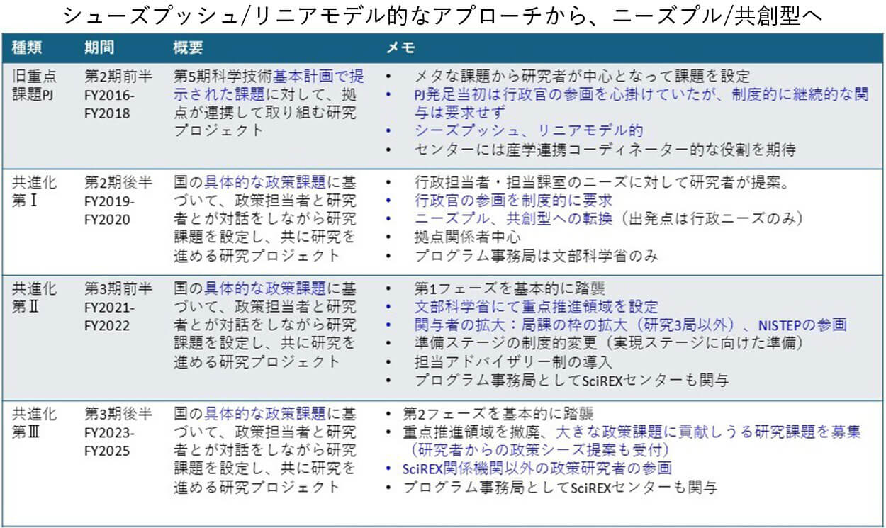 歩んできた15年間は3期で構成されています。研究面では、RISTEXでの公募型の研究やNISTEPでの政策課題対応型調査研究が行われてきたことに加え、第一期から各基盤的研究・人材育成拠点における研究が実施されています。第二期ではそれに加え、政策形成の実践につながる具体的な成果の創出を目指す重点課題に基づく研究プロジェクトをまず3年間走らせました。しかし、研究成果が政策形成に直接影響を与えた例は必ずしも多くなかったとの振り返りがなされたことから文部科学省では、「政策に具体的貢献ができるような成果の創出や行政官と研究者の真の共進化の推進を強力に実現させるため」、第二期の途中から共進化実現プログラムの第Ⅰフェーズを開始したのです。これが第三期の第Ⅱフェーズ、第Ⅲフェーズへと続き、現在に至っています(図1)。
