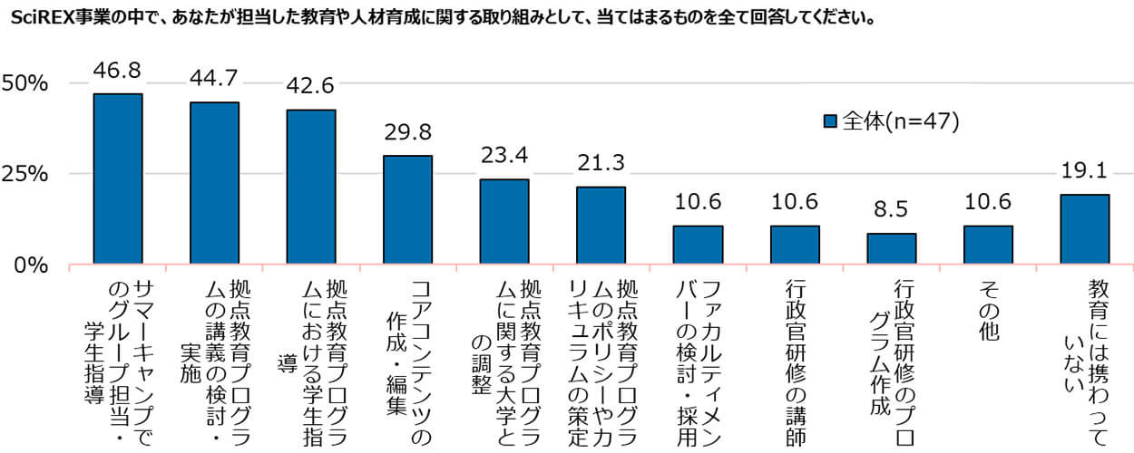 教職員等においては、研究成果が政策の現場などで一部でも活用されたとする回答割合が7割を超えている。SciREX事業の中で担当した教育や人材育成に関する取組については、「サマーキャンプでのグループ担当・学生指導」が最も高く、「拠点教育プログラムの講義の検討・実施」や「拠点教育プログラムにおける学生指導」も比較的高い。