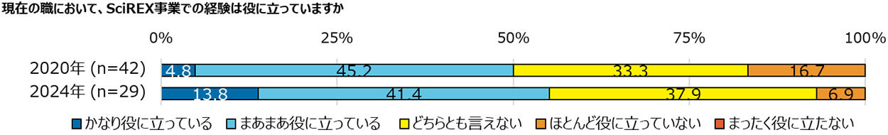 行政官では、現在の職においてSciREX事業での経験が比較的役に立っていると回答した割合は55.2%である。否定的な回答には、異動や転職等により役立てにくい分野に従事してしまったという理由が多い。行政官が研究プロジェクトに関与する上での課題認識や改善点についても、人事異動に関する意見が多くなっている。