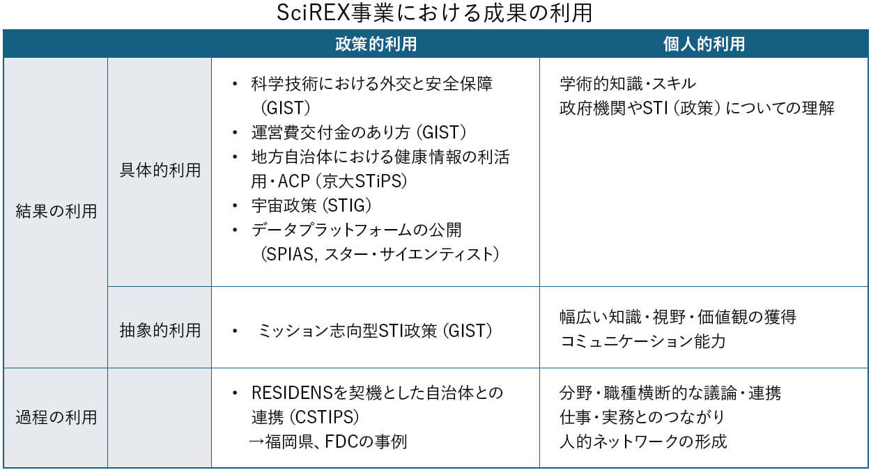 GISTとSTIGは中央省庁との物理的・人的な距離も近しいことから、SciREX事業に関わる研究者が政策に関する研究会を通じて政策提言を行ったり、研究者自身が政府審議会で研究成果の発表、知見の提供やネットワークの構築を通じて政策形成に影響したりするという事例が見られる。京大STiPSとCSTIPSは地域の自治体との関係を強め、健診データやRESIDENSといった研究成果が自治体の政策に直接利用されることもあれば、こうした共同研究や連携を通じて神戸市におけるACPや福岡県調査統計課における出生率要因分析などに活用されるなど、副次的な影響も出てくる。これらの事例は言わば、具体的利用と過程の利用という複合的成果であり、関係性のダイナミクスでもある。SciREX事業を通じて実施した「政策のための科学」に関する研究は、研究成果を研究会における議論やデータという形で社会的に可視化すると、中央省庁や地方自治体が直接的に政策利用しやすいものとなる。そうして行政や政策担当者との関係が密接になって信頼を得るようになると、委受託や研究助成のような枠組みや審議会委員の委嘱などの継続的で信頼感のある公式の関係性へ発展していく。